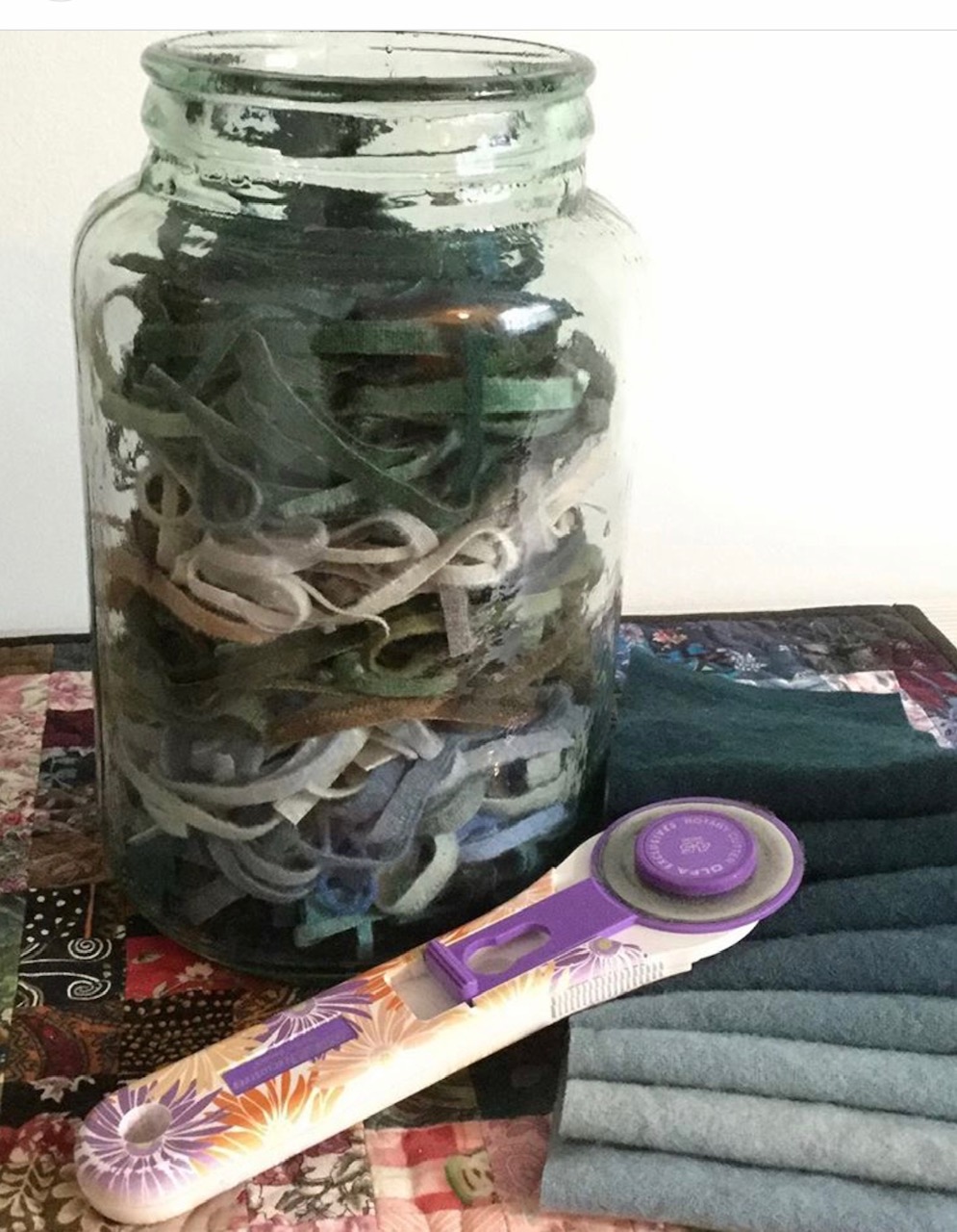 thank you Susan). A few years back, a good friend showed me some wool fabric she was planning to rid herself of. She had been a rug hooker for many years but had pretty much given up that hobby for several others, so of course, I could not resist these beautiful hand dyed wools and said that perhaps I could do something with it. Well...guess what...it came to my house only to sit on a shelf until I finally decided I had to use it or move it on.