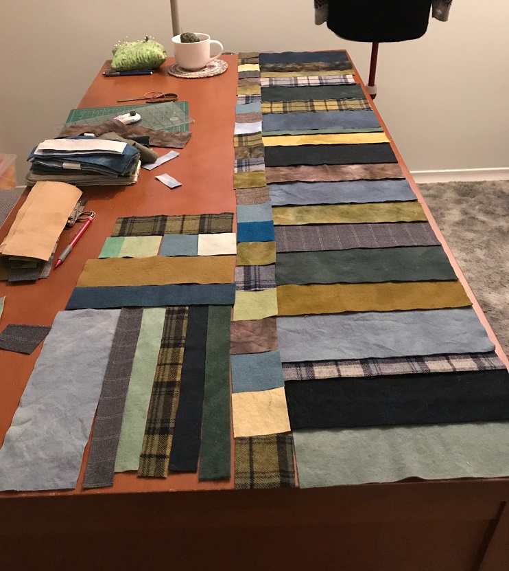 Once we each had a pleasing layout, the pieces were simply machine stitched by butting the raw edges up to each other and using a triple zig zag which was such a pleasant sewing process. Long vertical rows were created, then each row was attached to the next in the same manner