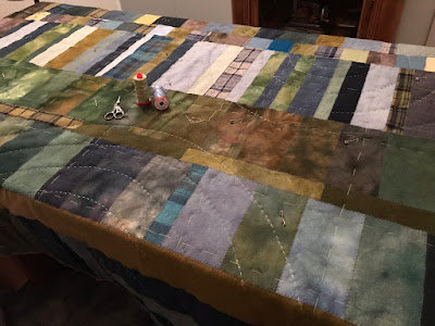 A piece of soap served to mark the concentric circles which I would hand stitch using 12wt Aurifil cotton. The flannel for the back was only 45" wide....it needed to be pieced to get the required width, Susan pieced hers entirely with the flannel